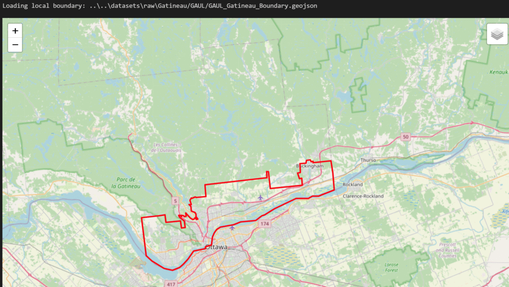 Using GEE, I queried the Level 2 administrative boundary for Gatineau, Canada, and simplified the geometry to a 100m resolution. This reduces computational overhead while giving our arrays a precise mathematical boundary to clip against.