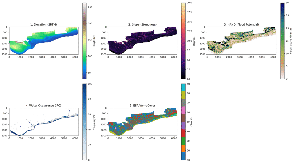 We have the absolute constraints of the Earth’s surface (DEM, Slope, HAND), the historical memory of the rivers (JRC, MERIT Hydro), the physical friction of the landscape (ESA WorldCover), the atmospheric fury that caused the event (Weather data), and the exact microwave reflection of the floodwaters as seen from 700 kilometers in space (Sentinel-1 SAR.