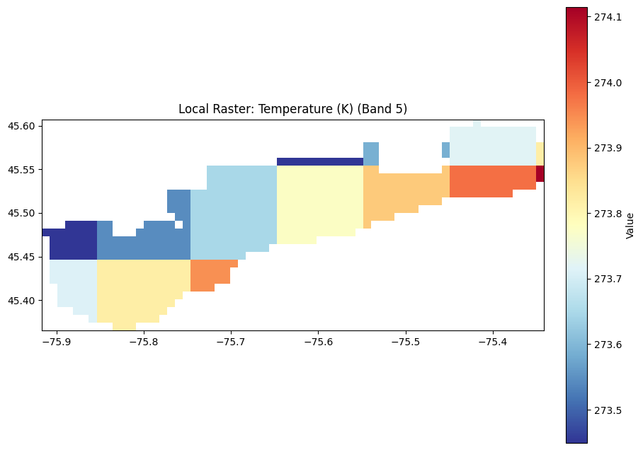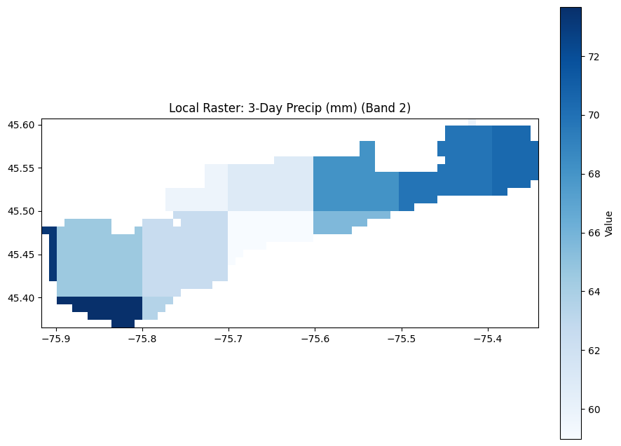 A landscape doesn’t flood itself, it requires an atmospheric forcing function. To give the model the cause-and-effect relationship, I extracted 1km-resolution weather grids covering the weeks leading up to and during the flood. By ingesting daily precipitation (how much water is falling) and temperature (critical for identifying spring snowmelt in the Canadian context at least) – also temperature is usually* most indicative of a lot of weather anomalies, seasonality and patterns