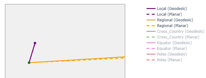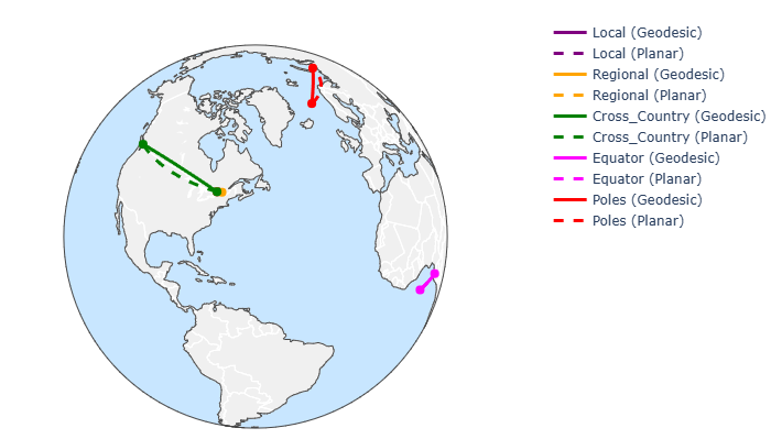 we see the geodesic and planar distance are noticeably different on large scales because of earth’s curvature