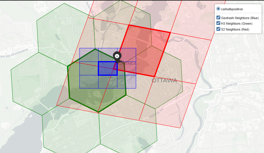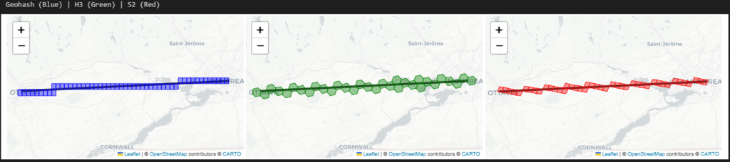 To see how these indexing systems behave in practice, let’s look at a specific coordinate in Ottawa (Lat: 45.428, Lon: -75.718) and map it to a “City” resolution across all three systems.