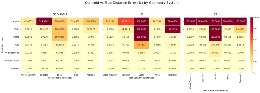 The “Local” Distance Anomaly: If you look at the “Local” test scenario (a distance of roughly 5 km) across all three systems, the error hits exactly 100.0000% at the “State” and “Largest” levels. This happens because the physical distance being measured is vastly smaller than the cell itself. If both points fall into the exact same massive cell, the calculated centroid distance is 0, resulting in a 100% error. This is a vital reminder: never use a spatial index resolution that is physically larger than the phenomena you are trying to measure.