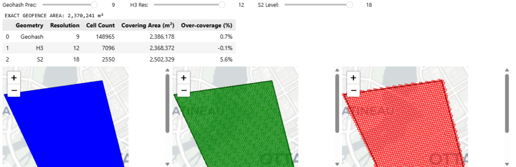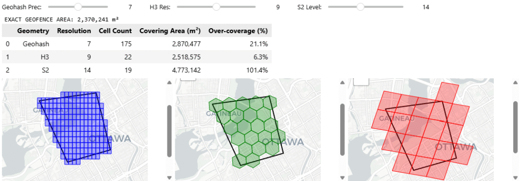 The Borderline Point: The exact math confirmed the point was inside. Geohash and S2 successfully flagged it via set lookup. However, H3’s native set lookup returned False. Because hexagons don’t perfectly conform to sharp, straight polygon edges, the H3 polyfill algorithm left a slight gap at the border, resulting in a false negative.