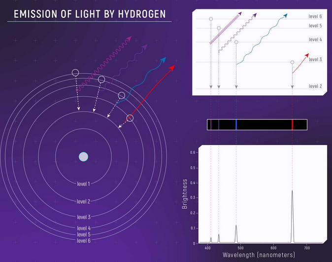 The excited electrons will jump back to their ground state releasing the same energy they absorbed – causing an emission of radiation of the same wavelength and frequency – if we observe this emitted light (in all directions) – we will notice an emission spectrum, which is sparse. It is also a fingerprint spectra, you can get more details on Balmer and Layman and Paschen lines in another upcoming article.